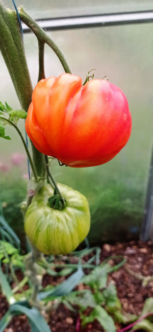 Transplant into Greenhouse after frost risk has passed and night time temperatures remain above 10°C. Space plants 50–80 cm apart with sturdy support. Plant deep—burying part of the stem—to promote root development.