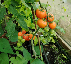 It is a tomato which will need staking and grows to about 1.8 metre, but does not grow not quite as tall as some of the cherry tomato types I grow (Black Cherry Chocolate Cherry etc). The fruits are about 3 inches across, so larger than a cherry, but smaller than a beefsteak.