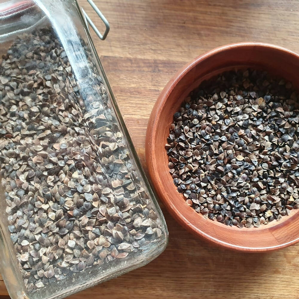 If possible protect from birds after sowing, with a net. Keep well weeded by hoeing between the rows. Cereals can be used green for tea and grass, as well as mature and dried. For tea, harvest when the seeds exude a white milk when pressed under a nail. The main crop should be harvested when the plants have turned brown and the seeds are no longer milky, or when the birds start to eat them. The plants should then be harvested by cutting them at the base, bundling them into sheaves and drying under cover. They can be threshed by running through a garden shredder, although this damages the seeds a bit or by banging the plants on the edge of a bucket or barrel. They then need to be winnowed in a stff breeze to remove the debris. Oats need to be dehulled, steamed and rolled to make the familiar flaked oats used for porridge. Hulless oats may be simply soaked and boiled to make porridge or ground into flour. Wheat and rye can be ground into flour.