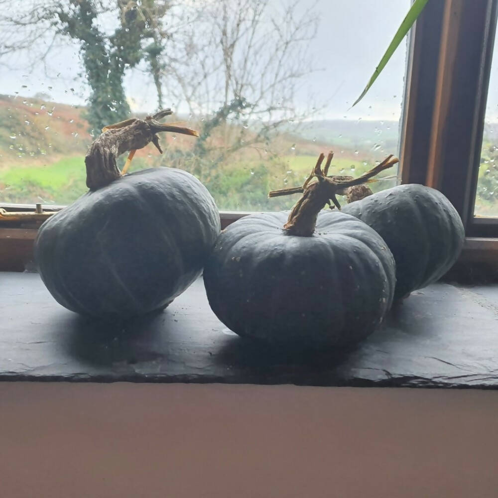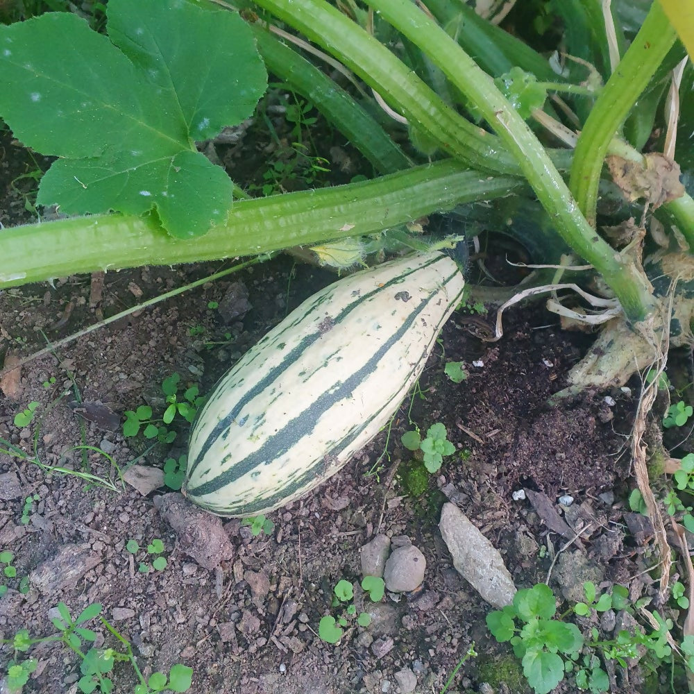 We grow three species of squash, pumpkins or courgettes. All were domesticated in the Americas. Cucurbita pepo includes courgettes Cocozelle and Costata Romanesco, hulless seeded pumpkin Lady Godiva and winter storage squash Candystick Delicata. It also includes many big orange pumpkins. Wiinter squash or pumpkins Ushiki Kuri Blue Kuri and Oregon Homestead Sweetmeat are Cucurbita maxima, these have hard dense, and often sweet flesh. They are good keepers. Also good keepers are Cucurbita moschata squash, which are all beige, like the Butternuts. GrowingSow squash seeds in small pots or modules in a warm place, such as a greenhouse or windowsill between March and June. Keep the plants in doors until the nights are warm and transplant to larger pots as necessiary. Plant out in May or June and protect from slugs.