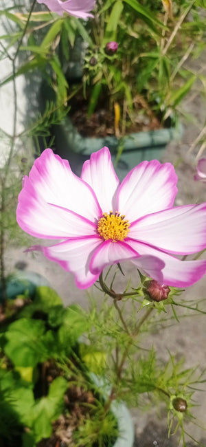 Light feeder. Prepare soil with a small amount of compost before planting. Avoid heavy fertilization—especially nitrogen—as cosmos thrive in lean soils and bloom best with minimal feeding.