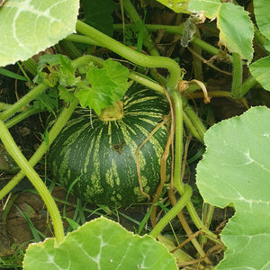 A productive Cucurbita moschata which grows and ripens well outside in Ireland. Striking panther print pattern on the skin which lightens in colour as the squash cure. Fruits ranging from around 25 – 35cm in diameter. The firm flesh is a vibrant orange colour and the central cavity is small. I found it not so good for roasting as other squash – it seems to be wetter and almost mushy when roasted compared to the more starchy maxima type squashes. Perfect for soup and pies and eating raw. Sow in 9cm pots in early May and plant out when plants are robust enough. Average 12 seeds per packet.